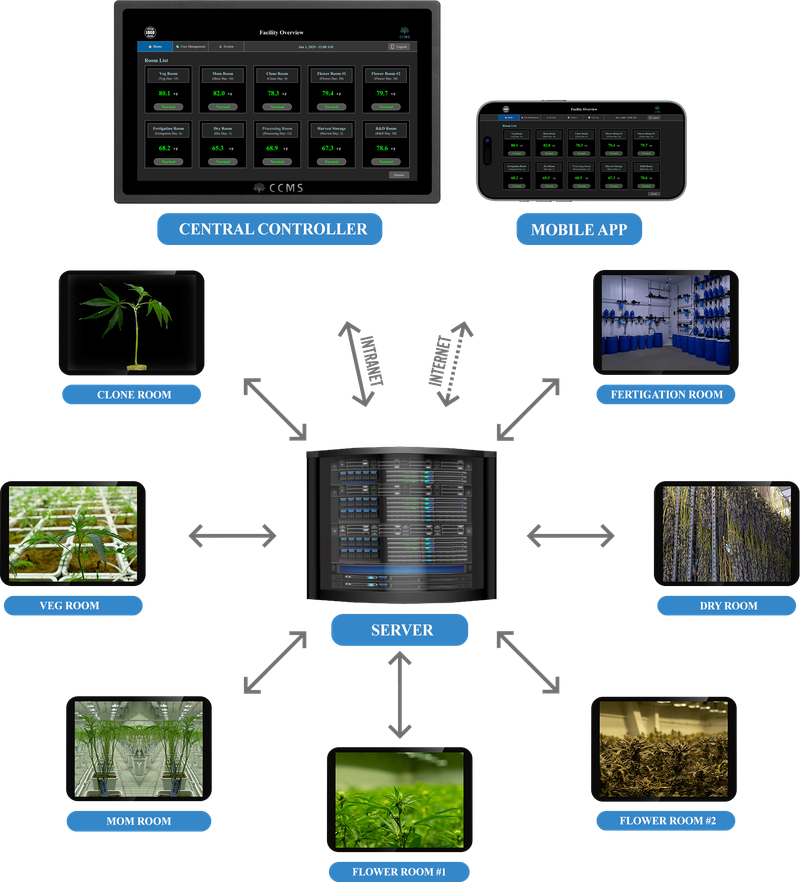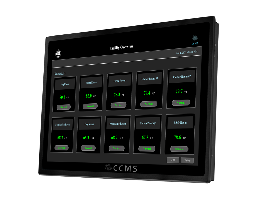 A commercial grade 13” touchscreen cultivation controller that monitors and controls devices to optimize room conditions. One CCMS controller per room.